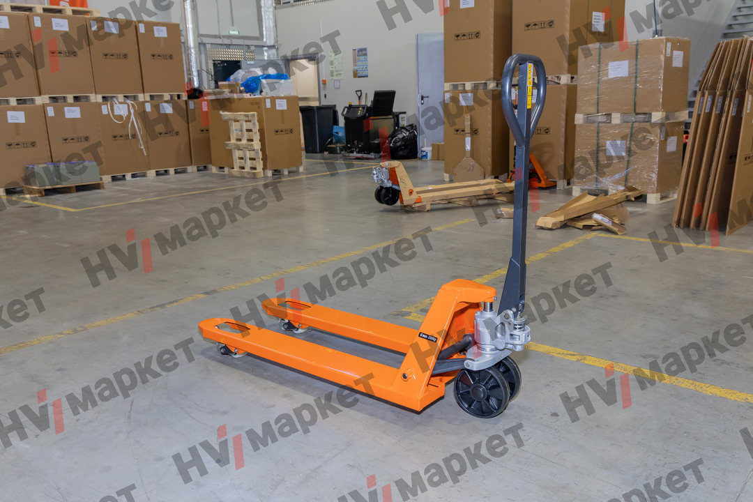Гидравлическая тележка эконом класса со стандартными вилами грузоподъемностью 2500 кг.