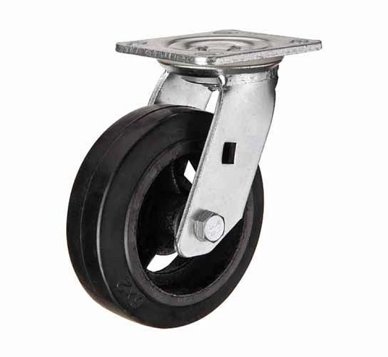 Колесная опора большегрузная поворотная из литой черной резины (чугунный обод, в оси - роликовый подшипник)